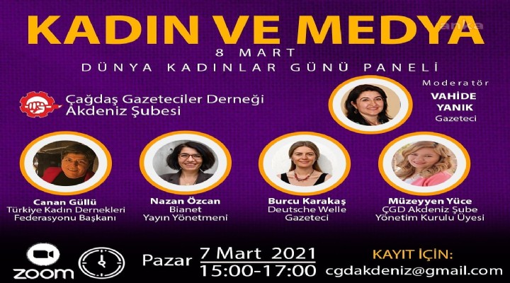 Moderatörlü?ünü gazeteci Vahide Yan?k’?n yapaca?? panelde, Türkiye Kad?n Dernekleri Federasyonu (TKDF) Ba?kan? Canan Güllü, Bianet Yay?n Yönetmeni Nazan Özcan, Deutsche Welle’den gazeteci Burcu Karaka? ve ev sahibi ÇGD Akdeniz ?ube’nin yönetim kurulu üyesi gazeteci Müzeyyen Yüce konu?mac? olarak kat?lacak.