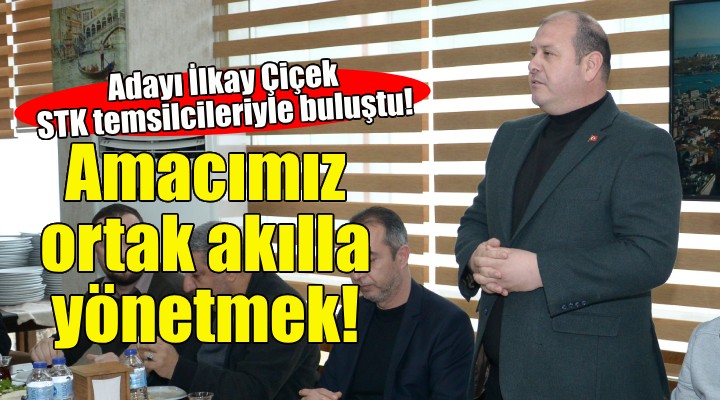 Ortak ak?l ile Menderes’i yönetmeye talip oldu?unu belirten CHP Menderes Belediye Ba?kan Aday? ?lkay Çiçek, ''?lçemizdeki sivil toplum kurulu?lar?n?n temsilcileri ile bir araya geldik. Amac?m?z ortak ak?l ile Menderes'i yönetmek, herkesin sesi olmak. Bu kapsamda sivil toplum kurulu?lar? ba?ta olmak üzere dernekler, odalar ve kurumlarla birlikte hareket etmek için kollar? s?vad?k. ?nan?yoruz! El ele, gönül gönül gönüle vererek Menderes'imizi gelece?e ta??yaca??z’’ dedi.