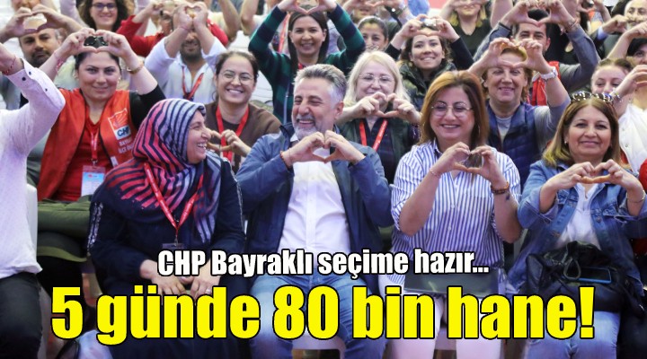 Türkiye, pazar günü yap?lacak genel seçimlere odaklan?rken Bayrakl? CHP ?lçe Örgütü yürütülen seçim çal??malar? kapsam?nda son 5 günde 80 bin haneye ula?t?. Binlerce vatanda??n Millet ?ttifak?’na deste?ini alan 250 ki?ilik gönüllü ordusu tüm ilçeyi kap? kap? gezdi. Stratejik propaganda kapsam?nda 13 mahalle belirleyen ilçe örgütü, 22 bin 827 apartmanda 78 bin 752 haneyi belirledi. CHP Bayrakl? ?lçe Ba?kan? Didem Gültekin öncülü?ünde olu?turulan ekipler; 75. Y?l, Adalet, Alpaslan, Bayrakl? Merkez, Cengizhan, Çay, Çiçek, Emek, Fuat Edip, Refik ?evket, Tepekule, Gümü?pala ve Muhittin Erener Mahallelerinde çal??ma yürüttü.