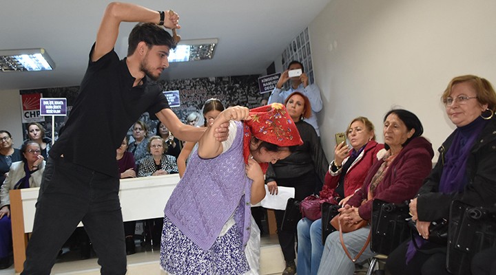 CHP ?zmir ?l Kad?n Kollar? taraf?ndan 25 Kas?m Kad?na Yönelik ?iddete Kar?? Uluslararas? Mücadele ve Dayan??ma Günü dolay?s?yla CHP ?zmir ?l Ba?kanl???'nda bas?n aç?klamas? gerçekle?tirildi. ?lçe ba?kanlar? ve partililerden olu?an CHP'li kad?nlar?n kat?ld??? etkinlikte, kad?nlar ellerinde '?iddet kad?nlar?n kaderi de?il', 'Kimsenin namusu de?iliz', 'Her sessiz kal?nan ?iddet bir gün sizi bulur', 'Bedenime dokunma' yaz?l? dövizler ta??d?. Ayn? zamanda etkinlikte, Narl?dere ilçe Kad?n Kollar? taraf?ndan haz?rlanan, gelin ve damat kostümü giyen gençlerin canland?rd??? gösteri büyük be?eni toplad?. Küçük ya?ta evlendirilen ve ?iddet gören kad?nlar?n canland?r?ld??? gösteri, ayakta alk??land?. Partililer ad?na bas?n aç?klamas?n? okuyan CHP ?zmir Kad?n Kollar? Ba?kan? Nur?en Balc?, "2019'un ilk on ay?nda 383 kad?n öldürüldü. Cinayetler kad?nlar?n en yak?nlar? taraf?ndan i?lendi. Baz?lar? uzakla?t?rma kararlar?na ra?men öldürüldü. Biliyoruz ki onlar 'E?it de?ilsiniz' dedikçe k?z karde?lerimiz öldürülüyor. Biz e?itiz, var?z. U?rad???m?z ?iddete kar?? susmayaca??z" dedi.
