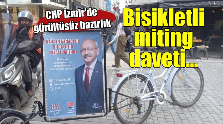 Partinin bütün seçim kampanyas? süresince çevreci propaganda yöntemlerini benimsediklerini vurgulayan CHP ?zmir ?l Ba?kan? ?enol Aslano?lu, çal??malar?n farkl? meydanlarda say?s?n?n art?r?larak devam edece?ini belirtti. Bisikletli miting davetlerine ?zmirlilerin gösterdi?i ilgiye te?ekkür eden Aslano?lu, "14 May?s'ta tüm Türkiye'de bir tarih yaz?lacak ve ?zmir mitingi bu tarihin kö?e ta?lar?ndan biri olacak. Tüm halk?m?z? olabilecek en güzel yollarla davet etmek istiyoruz. Bu miting için de bisikletlerle yapt???m?z çal??ma en anlaml? çal??malar?m?zdan oldu" diye konu?tu.