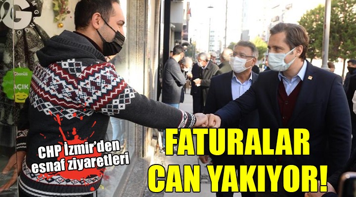 CHP ?zmir Milletvekilleri Tacettin Bay?r ile Sevda Erdan K?l?ç, Konak Mithatpa?a Caddesi'nde, Bedri Serter Karaba?lar'da, Mahir Polat ise Alsancak K?br?s ?ehitleri Caddesi'nde esnaf turu yapt?. Bal?k sat?c?s? bir esnaf elektrik faturas?n?n 87 bin lira geldi?ini ve bu nedenle dükkan?n? kapataca??n? söyledi. Alsancak'ta ve Karaba?lar'da da yüksek elektrik faturalar?ndan dert yanan yurtta?lar ve esnaf, AKP hükümetine tepki gösterdi.