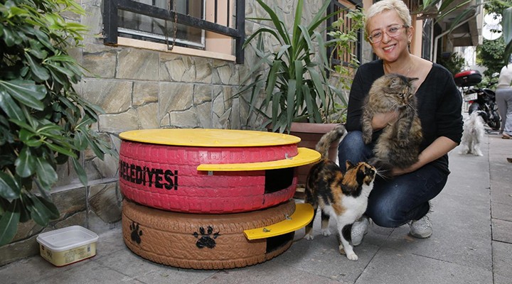 Konak Belediyesi sokakta ya?ayan kedilerin k?? aylar?nda so?uktan korunmas? amac?yla araba lastiklerinden ev yaparak minik canlara ula?t?rd?.