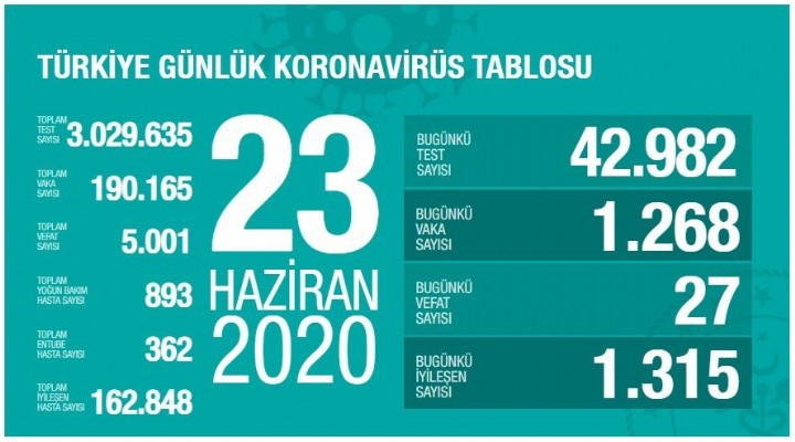 Bugün 42 bin 982 test yap?l?rken, bin 268 yeni vaka tan?s? konuldu, bin 315 ki?i ise iyile?ti.