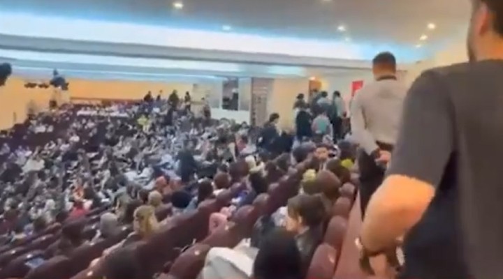Sempozyumda konu?ma yapmak üzere Sahneye Hafsa Sultan Hastanesi Ba?hekimi Hafsa Sultan Hastanesi Ba?hekimi Prof. Dr. ?smet Topçu, davet edildi. Ö?renciler, Topçu sözlerine ba?lar ba?lamaz salonu terk etti.
