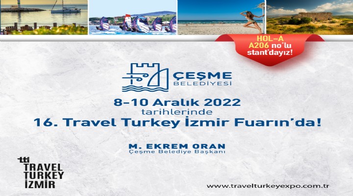 Kültür ve Turizm Bakanl??? himayelerinde, ?ZFA? ve TÜRSAB Fuarc?l?k i? birli?i ile dünyan?n dört bir yan?ndan turizm profesyonellerini bir araya getiren ve Türkiye'nin en büyük uluslararas? turizm platformlar?ndan biri haline gelen Travel Turkey ?zmir, 16'nc? kez kap?lar?n? aç?yor. Bu y?l 8-10 Aral?k 2022 tarihlerinde Fuarizmir'de gerçekle?ecek fuarda Çe?me’de geni? bir kat?l?mla yer alacak.