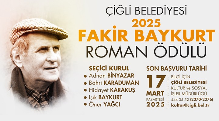 Ba?vurular 17 Mart 2025 Pazartesi gününe kadar kabul edilecek. Yar??maya ba?vurmak isteyenler bilgi için Çi?li Belediyesi Kültür ve Sosyal ??ler Müdürlü?ü’ne 444 35 52 (Dahili: 2370-23-76) numaral? telefon ve kultur@cigli.bel.tr üzerinden ileti?ime geçebilirler. Öte yandan 2025 Fakir Baykurt Roman Ödülü ?artnamesi’ne https://www.cigli.bel.tr/doc/fakirbaykurt/fakir_baykurt_teknik_sartname.pdf adresinden ula?abilirler.