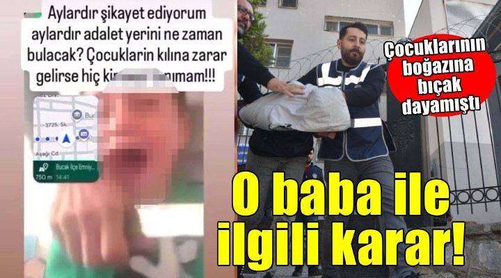 ?iddetli geçimsizlik nedeniyle bo?anma karar? alan Fatma Alpaslan, 2 çocu?unu e?i ?iyar Alpaslan'a b?rak?p Burdur'a gitti. ?iyar Alpaslan, 18 Kas?m 2024'te Fatma Alpaslan'? görüntülü aray?p yan?nda kalan çocuklar? Y.C.A. (7) ve B.A.'n?n (3) bo?az?na b?çak dayay?p tehdit etti. Fatma Alpaslan, emniyete gidip ?ikayetçi oldu. Ekipler, ?iyar Alpaslan'? Karaba?lar ilçesinde gözalt?na ald?. Çocuklar devlet korumas?na al?n?rken; Alpaslan i?lemlerinin ard?ndan ç?kar?ld??? mahkemede tutukland?. Gerekli incelemelerden sonra çocuklar annelerine teslim edildi.