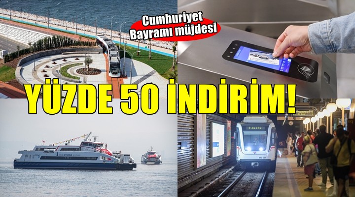 ?zmir Büyük?ehir Belediyesi, 29 Ekim Cumhuriyet Bayram?’nda kent içi toplu ula??mda düzenlemelere gitti. ?zmir Büyük?ehir Belediyesi’ne ba?l? toplu ula??m kurum ve kurulu?lar?nda ula??m yüzde 50 indirimli olacak. Büyük?ehir-TCDD ortakl???yla i?letilen ?ZBAN ise Cumhurba?kanl??? Kararnamesi do?rultusunda gün boyunca ücretsiz hizmet verecek.