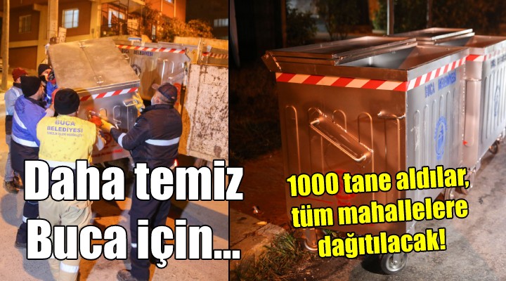 Buca Belediyesi, yeni eklenen bin adet çöp konteyneriyle birlikte 250 adet 3 bin litrelik yerüstü, 100 adet 5 bin litrelik yeralt? ve 6 bin adet galvaniz konteynerle ilçe genelindeki kapasitesini 6 bin 350 adet konteynere ç?kard?. 47 mahallede 3 bin 657 sokak, 54 cadde, 2 bulvar ve 2 küme evlerinde çal??malar?n? yürüten Buca Belediyesi Temizlik ??leri Müdürlü?ü’ne ba?l? ekipler, günde 350 ton evsel at?k, 60 ton moloz olmak üzere 410 ton at?k topluyor.