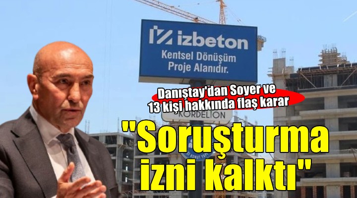 Dan??tay Birinci Dairesi, Eski ?zmir Büyük?ehir Belediye Ba?kan? Tunç Soyer'in de aralar?nda oldu?u 14 ki?i hakk?nda fla? bir karar ald?. Dan??tay, ?çi?leri Bakanl??? taraf?ndan Soyer ile 13 ki?i hakk?nda ?ZBETON garantörlü?ünde kooperatifler eliyle yürütülen kentsel dönü?üm çal??malar?nda "Belediyenin zarara u?rat?ld???" iddias?yla verilen soru?turma izni kald?rd?.