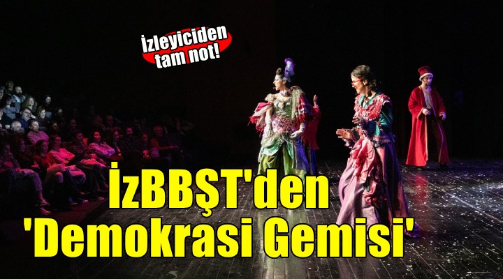 ?zmir Büyük?ehir Belediyesi ?ehir Tiyatrolar? (?zBB?T) yeni oyunu “Demokrasi Gemisi”nin prömiyerini yapt?. ?zBB?T ?smet ?nönü Sahnesi’ndeki prömiyere bürokratlar, gazeteciler, kültür ve sanat camias? ile tiyatroseverler kat?ld?. Usta yazar Aziz Nesin’in “Karagöz” metinlerinden hareketle ?zBB?T Genel Sanat Yönetmeni Yard?mc?s? Harun Özer’in geleneksel orta oyunu formunda sahneye uyarlad??? Demokrasi Gemisi, seyirciden tam not ald?. Günümüz Türkiye’sinde ya?anan aksakl?klar? mizahi bir dille hicveden oyunda, sanatç?lar?n performans? s?k s?k alk??larla kesildi.