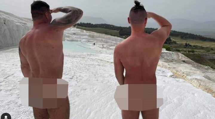 Türkiye'nin önemli turizm merkezlerinden Pamukkale'de, Polonyal? vücut geli?tirme sporcusu Marcin Modrzejewski ve yan?ndaki erkek arkada?? ç?plak poz verip foto?raf çektirdi.