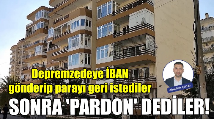 Depremzede yurtta?lar, ?BAN numaras? verip kendilerine ödenen ta??nma yard?m?n?n iadesini isteyen AFAD'a tepki gösterdi. Tuhaf durumun kamuoyuna yans?mas? ve tepkilerin ard?ndan AFAD geri ad?m att?. AFAD, Mustafa Bey Apartman? sakinlerine bu kez 15 ?ubat'ta "Taraf?n?za sehven gönderilen nakdi yard?m ödemesinin iadesine ili?kin k?sa mesaj?n dikkate al?nmamas? hususunda gere?ini rica ederim" yaz?l? ikinci bir SMS yollad?.