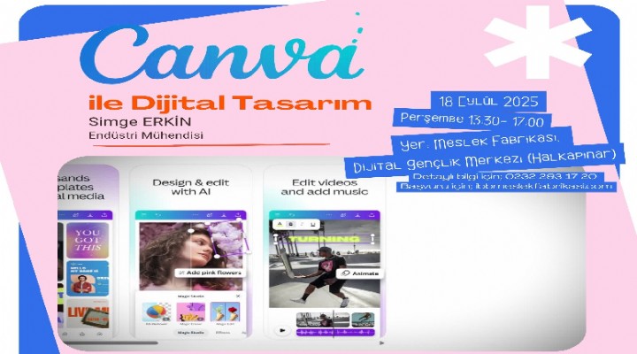 ?zmir Büyük?ehir Belediyesi Kad?n ve Aile Hizmetleri Dairesi Ba?kanl???’na ba?l? Meslek Fabrikas?, gençlerin ça??n teknolojik ve ekonomik geli?melerini yak?ndan takip etmesi ve bunlar?n aktif parças? hâline gelmesi amac?yla e?itimlerini sürdürüyor. Bu kapsamda Halkap?nar'daki Meslek Fabrikas? binas?nda yer alan Dijital Gençlik Merkezi'nde "Canva ile Dijital Tasar?m" e?itimi düzenlenecek. 18 Eylül Per?embe 13.30-17.00 saatleri aras?nda verilecek e?itim, ücretsiz olacak. Kat?l?mc?lar, Endüstri Mühendisi Simge Erkin'in rehberli?inde grafik tasar?m platformu Canva'y? kullanmay? A'dan Z'ye ö?renecek, portfolyo olu?turabilecek ve yapay zekâ ile içerik üretebilir hâle gelecek. 16-30 ya? aras? gençlerin kat?labildi?i ve kontenjan?n s?n?rl? oldu?u e?itime kaydolmak isteyenler https://www.ibbmeslekfabrikasi.com/tr/Kayitol/59 adresini ziyaret edebiliyor. Detayl? bilgi için 0232 293 17 20 numaral? telefon aranabiliyor.