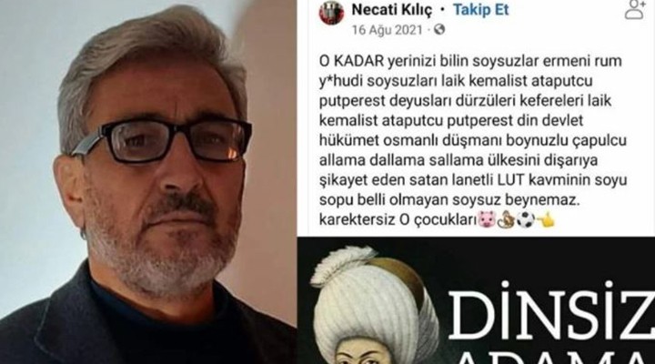 ??te, Din Kültürü ve Ahlak Bilgisi ö?retmeni Salih Ulusoy’un o payla??m?: “Yerinizi bilin soysuzlar! Ermeni, Rum, Yahudi soysuzlar?! Laik, Kemalist ataputçu, putperest deyuslar?, dürzüleri, kefereleri! Laik, Kemalist ataputçu, putperest! Din, devlet, hükümet, Osmanl? dü?man? boynuzlu çapulcu. Ülkesini d??ar?ya ?ikayet eden, satan lanetli Lut kavminin soyu sopu belli olmayan soysuz beynemaz. Karaktersiz o çocuklar?.”
