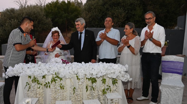 Ku?adas?’nda 1968 y?l?nda evlenen ancak maddi ko?ullar nedeniyle o tarihte dü?ün yapamayan 5 çocuk sahibi Mustafa Güne? (79) ve Güllü Güne? (75) çiftinin hayallerini 56 y?l sonra Ba?kan Ömer Günel gerçekle?tirdi. Bu kapsamda Hac? Bekta? Veli Anadolu Kültür Vakf? Ku?adas? Cemevi’nde dü?ün töreni düzenlendi. Dü?üne Ku?adas? Belediye Ba?kan? Ömer Günel, Ku?adas? Belediye Meclis Üyesi Ay?egül Da?l?, Ku?adas? Kent Konseyi Ba?kan? Mustafa Ünver, Hac? Bekta? Veli Anadolu Kültür Vakf? Ku?adas? ?ubesi Ba?kan? Erdal K?l?nç ve çok say?da davetli kat?ld?. Dü?ünde gerçekle?tirilen sembolik nikah k?yma töreninde çift, dünya evine girmenin heyecan?n? yeniden ya?ad?. ?mzalar?n at?lmas?n?n ard?ndan Ba?kan Ömer Günel, çifti tebrik ederek ömür boyu mutluluklar diledi. 56 y?ld?r hasretini çekti?i beyaz gelinli?i giymenin sevincini ya?ayan Güllü Güne? de havaya çiçek buketi f?rlatt?ktan sonra e?i Mustafa Güne? ile birlikte dans etti.