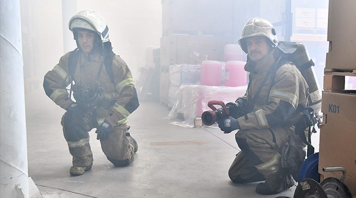 ?zmir Büyük?ehir Belediyesi ESHOT Genel Müdürlü?ü’nün, yasalar gere?i düzenli olarak yapt??? acil durum tatbikatlar?, aksiyon sahnelerini aratm?yor. Gediz A??r Bak?m Tesisleri’ndeki tatbikatta, senaryo gere?i 6,3 ?iddetinde deprem meydana geldi ve bu nedenle merkez ambarda elektrik sisteminde yang? ç?kt?. Personel, yan?c? malzemelerin tutu?mas?yla büyüyen alevleri fark ederek panik yapmadan ambar? terk etti ve itfaiyeyi ça??rd?. Öte yandan yang?n söndürmede ve tahliyede görevli personel ambara girerek, söndürme tüpleriyle yang?na ilk müdahalede bulundu.