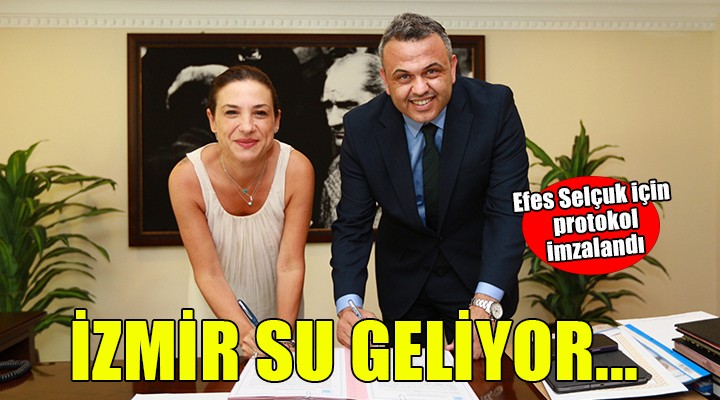 ?zmir Su protokolü Efes Selçuk Belediye Ba?kan? Filiz Cerito?lu Sengel ve ?zmir Büyük?ehir Belediyesi Grand Plaza Genel Müdür Yard?mc?s? Sabit Duran aras?nda imzaland?. ?zmir Su ilk olarak Efes Tarlas? Bakkal?’nda, ard?ndan da ekmek büfelerinin gel- al noktas? olarak kullan?lmas? ile halkla bulu?acak.