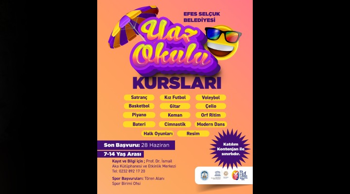 Efes Selçuk Belediyesi taraf?ndan düzenlenecek olan Yaz Okulu Kurslar? kapsam?nda düzenlenecek spor kurslar?n?n ba?vurular? için Tören Alan? Spor Birimi Ofisine, kültür kurslar? ba?vurular? için Prof. Dr. ?smail Aka Kütüphanesi ve Sosyal Etkinlik Merkezi’ne ula?mak yeterli olacak. Efes Selçuk Belediyesi Yaz Okulu Kurslar?na kat?l?m kontenjan ile s?n?rl? olacak.