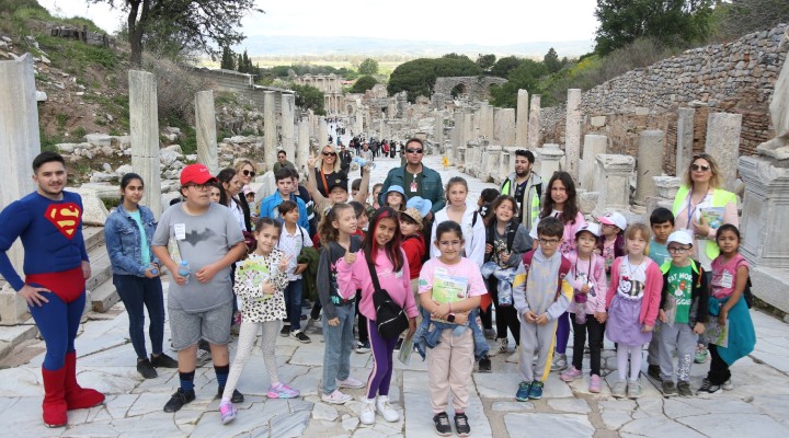 Sabah?n erken saatlerinde Efes Selçuk Belediyesi hizmet binas? önünde toplanan 7- 14 ya? aras? 250 çocuk Efes Antik Kenti içerisinde yer alan antik tiyatro, Liman Caddesi, Hadrian Tap?na??, Celsus Kütüphanesi gibi birçok önemli noktay? rehber e?li?inde gezdi.