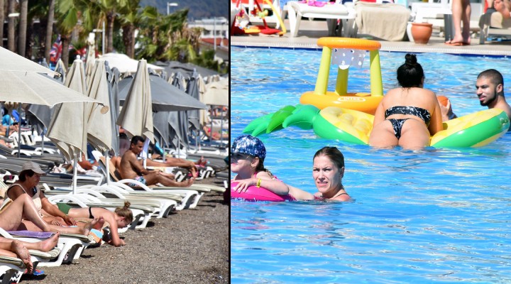 Hava s?cakl?klar?n?n mevsim normallerinin üzerinde seyretti?i Marmaris'te, past?rma yaz? ya?an?yor. Türkiye'nin birçok ?ehrinde sa?anak etkili olurken, Marmaris'teki halk plajlar? yaz aylar?n? aratmayan görüntülere sahne oluyor. Caddeye konumland?r?lm?? elektronik termometrenin 31 dereceyi gösterdi?i kent merkezinde, deniz suyu s?cakl??? ise 17 derece olarak ölçüldü. Plajlar, güne?lenen ve denize girenlerle doldu. Baz? turistler ?ezlonglar?nda uzanarak ekim ay? güne?inde bronzla?maya çal??t?. Baz?lar? da kitap okuyarak, dinlenmeyi tercih etti. Plajda sandalyelerinde oturup, e?siz deniz manzaras? e?li?inde çaylar?n? yudumlayanlar da oldu. Jet ski, muz, hamburger ve deniz para?ütü gibi su sporlar? araçlar?yla e?lenenler ise heyecan dolu anlar ya?ad?. Bunun yan?nda otellerin havuz ba?lar? da benzer kalabal?klara sahne oldu. Çocuklar?yla otel havuz ba??na gelen turistler, günü boyu an?n keyfini ç?kard?.