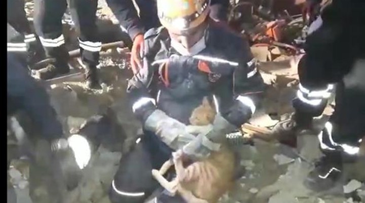 Depremde y?k?lan binalarda arama kurtarma çal??malar?n? sürdüren ekipler, binalardan birisinde y?k?nt?lar?n aras?nda kalan kediyi fark etti. AFAD ekipleri, kediyi kurtarmak için çal??ma ba?latt?. Bir AFAD görevlisi, beton bolu?un alt?na girip enkazda mahsur kalan kediyi ç?karmay? ba?ard?. Yap?lan kontrolde kedinin herhangi bir yaras?n?n bulunmad??? belirlendi. Görevliler, kediyi bir süre sevdikten sonra b?rakt?.