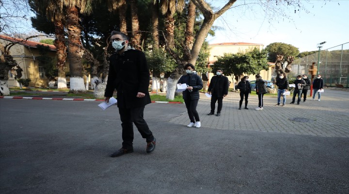 S?nav?n gerçekle?tirildi?i merkezlerden olan ?zmir Atatürk Lisesinde, adaylara Kovid-19 tedbirleri kapsam?nda sosyal mesafe uyar?lar?nda bulunuldu. Adaylara görevliler, maske ve dezenfektan da??tt?.