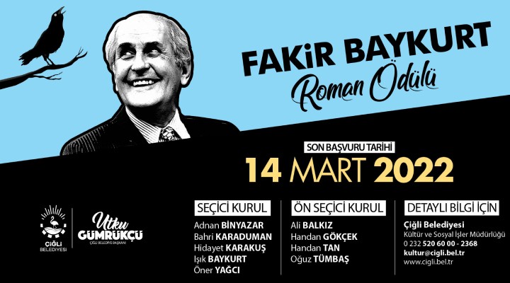 Kültür ve Sosyal ??ler Müdürlü?ü’nün organize etti?i Fakir Baykurt Roman Ödülü’nün dosya müracaat ba?vurular? için geri say?m sürüyor. Seçici kurul üyeli?ini Adnan Binyazar, Bahri Karaduman, Hidayet Karaku?, I??k Baykurt ve Öner Ya?c?’n?n yapt??? roman ödülü için ba?vurular 14 Mart 2022 tarihinde sona erecek. Roman Ödülüne kat?lmak isteyen vatanda?lar, Kültür ve Sosyal ??ler Müdürlü?ü’nün 0232 520 60 00 - 2368 numaral? hatt?ndan veya kultur@cigli.bel.tr adresinden kat?l?m ?artlar? ve süreciyle ilgili detayl? bilgi alabilecek.