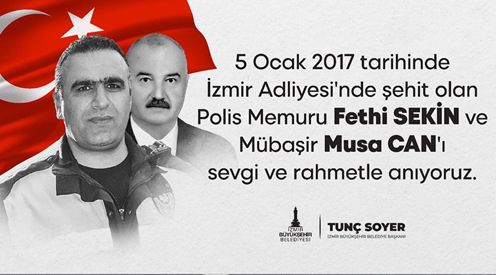 ?zmir Büyük?ehir Belediyesi, 5 Ocak 2017’de ?zmir Adliyesi’ne yönelik terör sald?r?s?nda ?ehit olan polis memuru Fethi Sekin ile müba?ir Musa Can için yar?n 4 bin ki?ilik lokma döktürecek.
