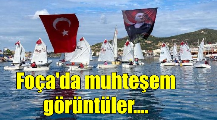 Foça'da Hükümet Kona?? önünde gerçekle?tirilen resmi Cumhuriyet Bayram? kutlamas? program?n?n ard?ndan, Kutlamalar daha sonra Küçükdeniz Liman? içinde yelkencilerin gösterileri ile devam etti. Foça Yelken ?htisas Kulübü'nün 7- 14 ya? aras?ndaki sporcular? liman?n iki yakas? aras?na gerilen halatlara as?lan dev Türk bayra?? ve Atatürk posterlerinin aras?nda yelken bast?. Suya akseden bayrak ve posterin izdü?ümleri aras?nda dola?an beyaz yelkenliler renkli görüntüler olu?turdu. Sahildeki Foçal?lar ve ilçeyi ziyaret eden tatilciler, yelkencilerin kutlamas?n? keyifle ve zaman zaman alk??layarak izledi.
