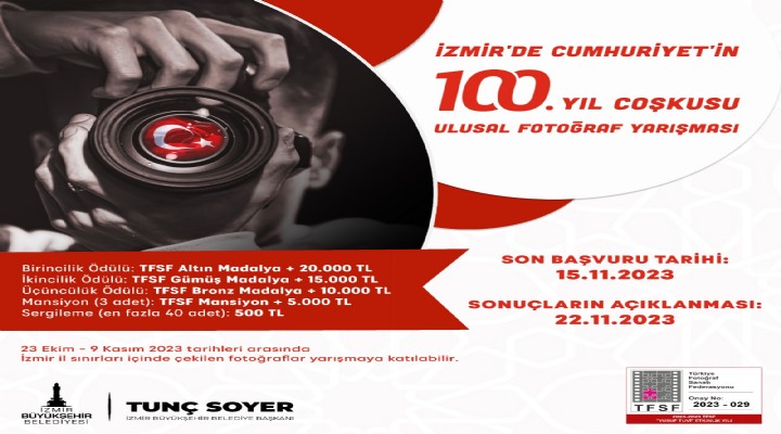 ?zmir Büyük?ehir Belediyesi, Cumhuriyet’in 100’üncü y?l? kutlamalar? kapsam?nda “?zmir’de Cumhuriyet’in 100. Y?l Co?kusu” konulu Ulusal Foto?raf Yar??mas? düzenliyor. ?zmir Büyük?ehir Belediyesi Kültür ve Sanat Dairesi Ba?kanl??? taraf?ndan düzenlenen yar??mada, foto?raf sanat? arac?l??? ile Cumhuriyet’in 100’üncü y?l? kapsam?nda yap?lacak etkinlik ve kutlamalar?n belgelenmesi, amatör-profesyonel foto?rafç?lar?n ?zmir’de bulu?turulmas?, kentteki bu tarihi günlere ait görsel bellek olu?turulmas? amaçlan?yor. Yar??mada 23 Ekim - 9 Kas?m 2023 tarihleri aras?nda çekilen foto?raflar de?erlendirmeye al?nacak.