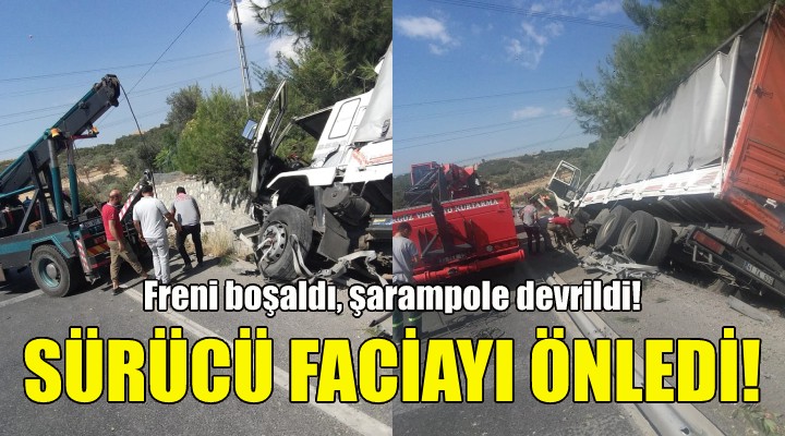 Manisa-?zmir Karayolu Bornova Yeni Mezarl??? mevkisinde A.B idaresindeki 41 AT 899 plakal? kamyon, freninin bo?almas? sonras? sürücünün manevras?yla yol kenar?ndaki ?arampole devrildi.