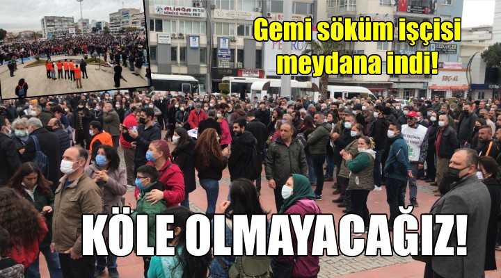 "Bizler günlerdir insanca çal??ma ve ya?am ko?ullar? talebiyle direnen Alia?a Gemi Söküm i?çileriyiz. Haklar?m?z?, al?nterimizin kar??l???n? istiyoruz. Y?llard?r tersane patronlar?n?n bizlere reva gördü?ü ya?am?, çal??ma ko?ullar?n? kabul etmiyoruz. Günlerdir taleplerimizi tek tek s?ralad?k. Ancak görmeyen gözler, duymayan kulaklar için bir kez daha buradan hayk?rmak için topland?k. Karde?ler diyoruz ki; Gemi söküm cehennem i?çiler köle kalmayacak."
