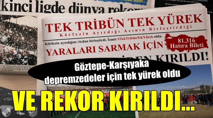 Göztepe ve Kar??yaka kulüplerinden yap?lan aç?klamada, "Rekor yeniden k?r?ld?. Körfezin ay?rd???n? vicdan birle?tirdi. ?zmir 'TekTribünTekYürek' oldu. 6 ?ubat depreminin yaralar?n? sarmak amac?yla ba?latt???m?z hat?ra bileti kampanyas?nda 81 bin 316 bilet sat?ld?." ifadelerine yer verildi.