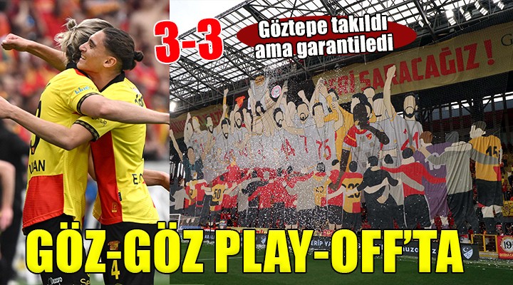 Spor Toto 1’inci Lig’de Göztepe ile Çaykur Rizespor aras?nda oynanan maç adeta nefesleri kesti. Bir yandan Play-Off’u garantilemek isteyen Göztepe, bir yandan direkt Süper Lig’e yükselmeyi hedefleyen Çaykur Rizespor Gürsel Aksel Stad?’ndaki randevuda 3-3 berabere kald?. Bu sonucun ard?ndan Çaykur Rizespor, rakibi Pendikspor’un Band?rmaspor’u 2-1 yenmesiyle Süper Lig’e resmen ç?k???n? önümüzdeki haftaya erteledi. Evinde Alt?nordu’yu konuk edecek Çaykur Rizespor sahadan puan ya da puanlarla ayr?lmas? durumunda geçen sezon veda etti?i Süper Lig’e geri dönecek. Göztepe, ise 86’nc? dakikaya kadar 3-1 önde götürdü?ü maçta bir puana raz? olup puan?n? 59’a yükseltti. Göztepe ise matematiksel olarak Play-Off’ta yer ald?. Göztepe rakipleri Eyüpspor, Ankara Keçiörengücü ve Manisa Futbol Kulübü’nün olas? ikili, üçlü ve dörtlü averaj hesaplar?nda önünde yer al?yor.