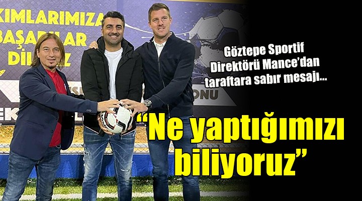 Taraftardan biraz sab?r isteyen Sportif Direktör Mance, "?unu da anlamal?y?z, Göztepe'nin Süper Lig'den dü?tü?ü çok travmatik bir sezondan sonra göreve geldik. Ruhsal olarak oyuncular, çal??anlar herkes psikolojik çökü? içindeydi. 22 yeni oyuncu getirdik. Hata tabii ki yapabiliriz. Hata yapmamak imkans?z ama daha uzun vadeli olarak bize katk? sa?layacak yap?y? in?aa ediyoruz. Bu projenin içerisindeki herkes, Ba?kan Rasmus Ankersen, ben, Sport Republic'in her üyesi daha önce ayn? yöntemlerle ciddi ba?ar?lar elde ettik. H?rvatistan'da Rijeka'da 7.5 y?lda 70 milyon Euro kar ettik. Biz ne yapt???m?z? biliyoruz. Yaln?z biraz zamana ihtiyac?m?z var. Taraftardan beklentimiz biraz sab?r. Bu zamana yayd???m?zda ba?ar?l? olacak bir proje" dedi.