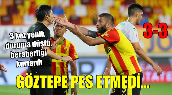 Süper Lig'de üst üste Trabzonspor ve BTC Türk Yeni Malatyaspor maçlar?n? kaybeden Göztepe, Aytemiz Alanyaspor kar??s?nda son dakikada att??? golle ma?lubiyetten kurtuldu: 3-3. Gürsel Aksel Stad?'nda seyircisiz oynanan maçta perdeyi 4'te Efecan açt?, Göztepe 11'de Serdar'la dengeyi kurdu. Konuk tak?m ilk yar?n?n uzatma dakikalar?nda Cisse'nin golüyle soyunma odas?na galip girdi. ?kinci yar?ya h?zl? ba?layan Göztepe 49'da Alpaslan ile tekrar beraberlik golünü att?. Cisse 64'te bir kez daha sahneye ç?karak Alanyaspor'u öne geçirdi. Ancak maçta son sözü 90'da Napoleoni söyledi.