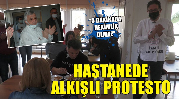 ?zmir Tabip Odas? Ba?kan? Lütfi Çaml? hastane yemekhanesinde, sa?l?k çal??anlar?n?n sorunlar?n?n çözümü için ad?m atmad???n? öne sürdü?ü yetkilileri protesto etmek amac?yla alk??l? protesto ba?latt?. Protestoya yemekhanedeki baz? hekimler de kat?ld?.