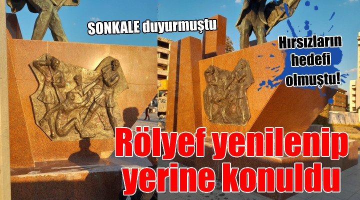 SONKALE?ZM?R - ?zmir'de h?rs?zlar?n hedefi olan ve zarar verilen Hasan Tahsin An?t?'n?n yan bölümündeki rölyef SONKALE'nin gündeme getirdi?i haber sonras? yenilenerek ait oldu?u yere konuldu.