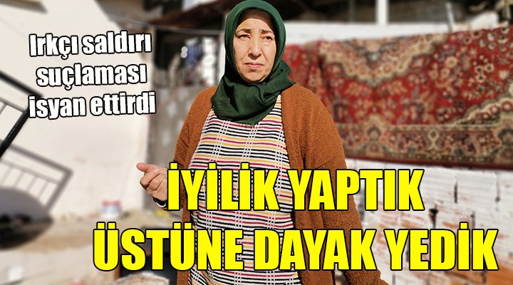 "Vücudumun her taraf? mosmor. Parma??m kesik, sol gözümde yumruk darbesi var. E?imin vücudu s?yr?klar içinde. O?lumun (Özgür Ufuk) kolu ç?k?k, kas y?rt??? var. Ameliyat olmas? gerekiyor. Çocuk daha yeni fabrikaya i?e girmi?ti, 1 ay rapor yollamak zorunda kald?. ??inden de oldu. Darp raporlar?m?z var. Sa?l?m?zdan ve i?lerimizden olduk. Üstüne bir de ?rkç? damgas? yemek büyük haks?zl?k. Biz nas?l ?rkç? olabiliriz! Y?llard?r burada bir sürü Suriyeli kom?umuz oldu. Bizi burada herkes tan?r. Onlara ne yard?mlar yapt???m? da herkes bilir. O küçük çocuklar için kendimi paralad?m. ?imdi bize bu iftiray? atanlar?, bu haks?zl??? yapanlar? Allah'a havale ediyorum. Linç diyorlar ya.. Bu nas?l linç! Onlardan bir yaral? var. Biz 3 ki?i yaraland?k. Böyle linç mi olur?"