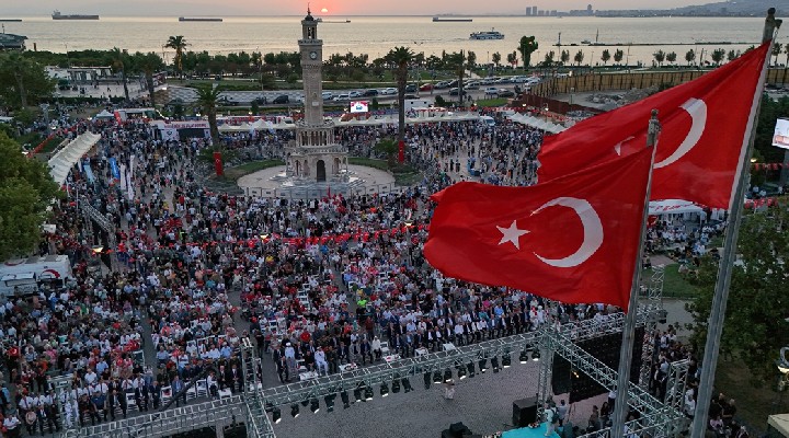?zmir'de ‘15 Temmuz Demokrasi ve Milli Birlik Günü' dolay?s?yla Atatürk Meydan?’nda tören düzenlendi. Törende; ?zmir Valisi Süleyman Elban, Ege Ordusu Komutan? Orgeneral ?rfan Özsert, ?zmir Cumhuriyet Ba?savc?s? Ali Yeldan, Sahil Güvenlik Ege Deniz Bölge Komutan? Tu?amiral Tayfun Pa?ao?lu, AK Parti Genel Sekreteri ve ?zmir Milletvekili Eyyüp Kadir ?nan, AK Parti ?zmir ?l Ba?kan? Bilal Sayg?l?, ?zmir Büyük?ehir Belediyesi CHP Grup Ba?kanvekili Altan ?nanç, MHP ?zmir ?l Ba?kan? Veysel ?ahin ile AK Parti ve MHP milletvekilleri kat?ld?. Sayg? duru?u ve ?stiklal Mar??'yla ba?layan etkinlik, Kur’an-? Kerim Tilaveti, ilahi ve kaside konseriyle devam etti. Program, Cumhurba?kan? Recep Tayyip Erdo?an'?n Be?tepe'den halka sesleni?inin ekrana getirilmesi ile sürdü.