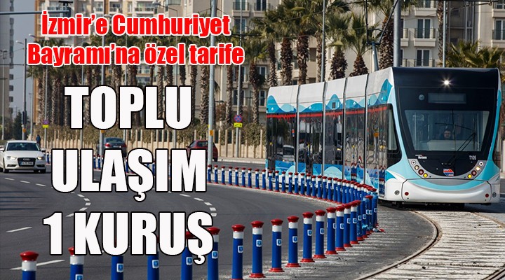 ?zmir Büyük?ehir Belediyesi, Türkiye Cumhuriyeti’nin kurulu?unun 99’uncu y?l dönümünde, 29 Ekim Cumartesi günü yap?lacak kutlamalara ?zmirlilerin kat?l?m? kolayla?t?rmak için toplu ula??m tarifesini 1 kuru? yapt?. ?zmir Büyük?ehir Belediyesi’ne ba?l? ESHOT, metro, tramvay ve ?ZDEN?Z, ?ZULA? ve ?ZTA?IT araçlar?, 29 Ekim 2022 Cumartesi günü boyunca 4736 say?l? yasa gere?i sembolik ücretle hizmet verecek.