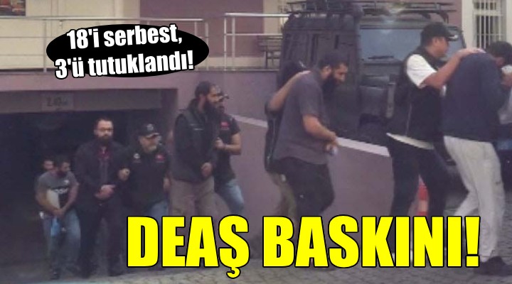 ?zmir Cumhuriyet Ba?savc?l??? Terör Suçlar? Soru?turma Bürosu'nca yürütülen soru?turmada; geçmi? dönemde DEA? ad?na çat??ma bölgelerinde faaliyet yürüten ve kentte terör örgütü ile iltisakl? ki?ilerle hareket eden 26 ?üpheliye yönelik gözalt? karar? verildi. ?üphelilere yönelik 27 Ekim 'de operasyon düzenlendi. E? zamanl? operasyonlarda 21 ?üpheli, gözalt?na al?nd?. ?üphelilerin ev ve i?yerlerinde aramalarda av tüfe?i, kurus?k? tabanca, çe?itli boyutlarda k?l?ç, b?çak ve çok say?da dijital materyale el konuldu. Di?er 5 ?üphelinin de yakalanmas? için çal??malar?n sürdü?ü bildirildi.