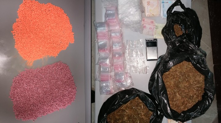 ?üphelilerin adreslerinde yap?lan aramalarda, M.K.'nin evinde 10 bin 100 uyu?turucu hap, C.D.'nin Kar??yaka'daki evinde yakla??k 1 kilo kokain, 1,5 kilo esrar ile 10 bin TL nakit para, A.B., Ü.K., Y.S. ve ?.S.'nin evlerinde ise toplamda 500 uyu?turucu hap ele geçirildi.