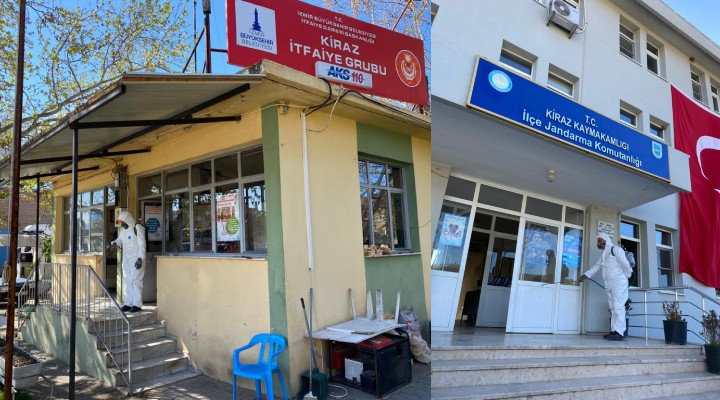 Her ilçeye e?it hizmet götüren Büyük?ehir Belediyesi’ne ba?l? ekipler, ?zmir’in Kiraz ilçesinde de dezenfeksiyon çal??mas? yapt?. ?lçedeki itfaiye binas?, ?lçe Jandarma Komutanl???, Kiraz ?lçesi Sosyal Yard?mla?ma ve Dayan??ma Vakf?, G?da Tar?m ve Hayvanc?l?k ?lçe Müdürlü?ü, Kiraz Ziraat Odas? Ba?kanl???, askeri lojmanlar, As?m Çavu? Park? gibi kamusal alanlar ekiplerin ilk çal??ma alanlar?yd?. Daha sonra toplu ula??m araçlar?, yayalar?n s?k kulland??? köprü ve çocuk parklar? dezenfekte edildi.