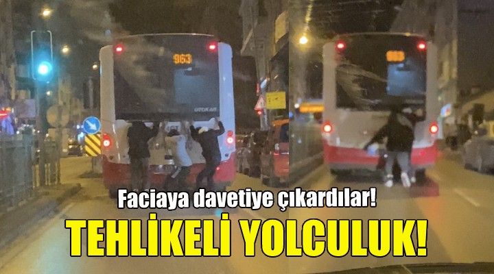 Bugün saat 21.30 s?ralar?nda Kaz?mdirik Mahallesi Mustafa Kemal Caddesi'nde paten süren 3 çocu?un yapt??? tehlikeli yolculuk saniya saniye görüntülendi. Alsancak Gar ile Evka 3 Metro ?stasyonu aras?nda sefer yapan 963 numaral? belediye otobüsünün arkas?na tutunarak kayan 3 çocuk, otobüsün h?z?na ald?rmadan dakikalarca yolculuk yapt?.