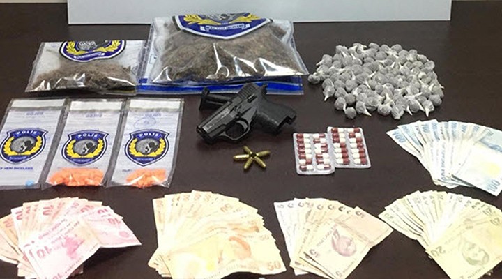Alia?a Emniyet Müdürlü?ü'ne ba?l? Narkotik Suçlarla Mücadele Grup Amirli?i ekipleri, Foça'daki evde uyu?turucu madde sat??? yap?ld??? ihbar? üzerine harekete geçti. Çal??ma ba?latan ekipler, söz konusu adrese operasyon düzenledi. Operasyonda, A.Y. (22), E.A. (17) , E.A. (20), T.E. (20), ?.B.D. (19), M.Ç.(22), E.A. (19) ve Ö.Ç. (19) gözalt?na al?n?rken, evde yap?lan aramada ise 500 gram esrar maddesi, 101 sat??a haz?r halde fi?ek tabir edilen esrarl? sigara, 65 ecstasy hap, 28 lilika diye tabir edilen hap, silah, silaha ait mermiler ve bir miktar para ele geçirildi. ?üpheliler sorgulanmak üzere emniyete götürüldü. Emniyetteki i?lemlerinin ard?ndan adliyeye sevk edilen E.A. ve Ö.Ç. serbest b?rak?l?rken, A.Y., T.E. ve E.A. ise tutukland?. Di?er ?üphelilerin emniyetteki i?lemlerinin devam etti?i ö?renildi.