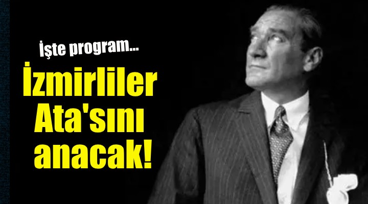 ?zmir, Türkiye Cumhuriyeti'nin kurucusu Mustafa Kemal Atatürk'ün 85’inci ölüm y?ldönümünde büyük bir özlemle Ata’s?n? anacak. ?zmir Büyük?ehir Belediye Ba?kan? Tunç Soyer, 10 Kas?m program?na saat 08.50’de Cumhuriyet Meydan?’nda çelenk sunma töreniyle ba?layacak. Saatler 09.05'i gösterdi?inde tüm yurtta oldu?u gibi ?zmir'de de siren sesleriyle birlikte sayg? duru?unda bulunulacak. ?zmir Büyük?ehir Belediyesi Sosyal Projeler Dairesi Ba?kanl??? ise Konak Atatürk Meydan?’nda saat 09.05’te “7’den 77’ye ?zindeyiz” koreografisi ile binlerce ?zmirliyi bulu?turacak. Ard?ndan Konak Atatürk Meydan?’nda ?zmir Büyük?ehir Belediyesi 100. Y?l Cumhuriyet Korosu’nun Ata’ya ?ark?lar konseri var.