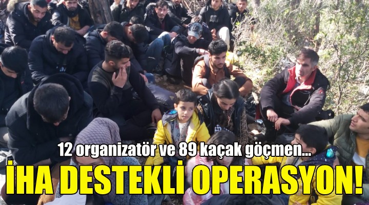 Jandarmaya ait insans?z hava arac?n?n da destek verdi?i çal??malarda Zeytinler Mahallesi, Ç?lga Koyu aç?klar?nda bir teknenin bekledi?i tespit edildi. Tekneye yap?lan bask?nda 12 organizatör gözalt?na al?nd?. Bölgedeki ormanl?k arazide yap?lan arama çal??malar?nda ise Afganistan, Suriye, Irak ve ?ran uyruklu 89 kaçak göçmen yakaland?.